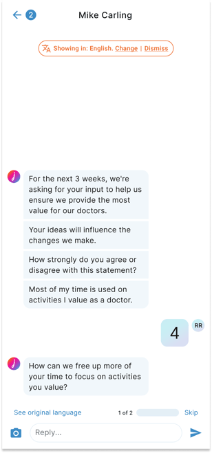 The first time we contact someone our system will detect their preferred language from their browser and ask them to confirm or change their preferred language: