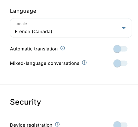 There are three configurable settings: Locale, Automatic translation and Mixed language conversations.