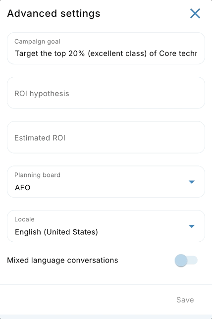 - If there are multiple languages within the campaign, click the Mixed language conversations toggle to enable it.