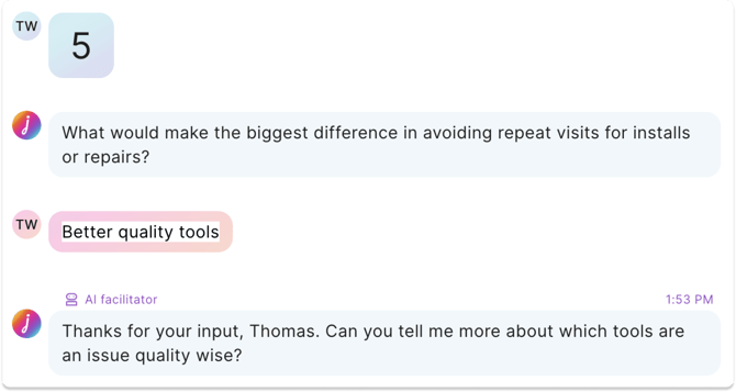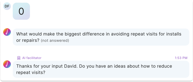 When an audience member leaves a short or vague comment that would benefit from more detail, the AI facilitator can seek clarification to improve the quality of insights: